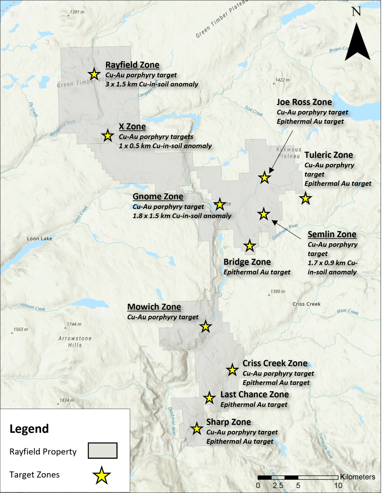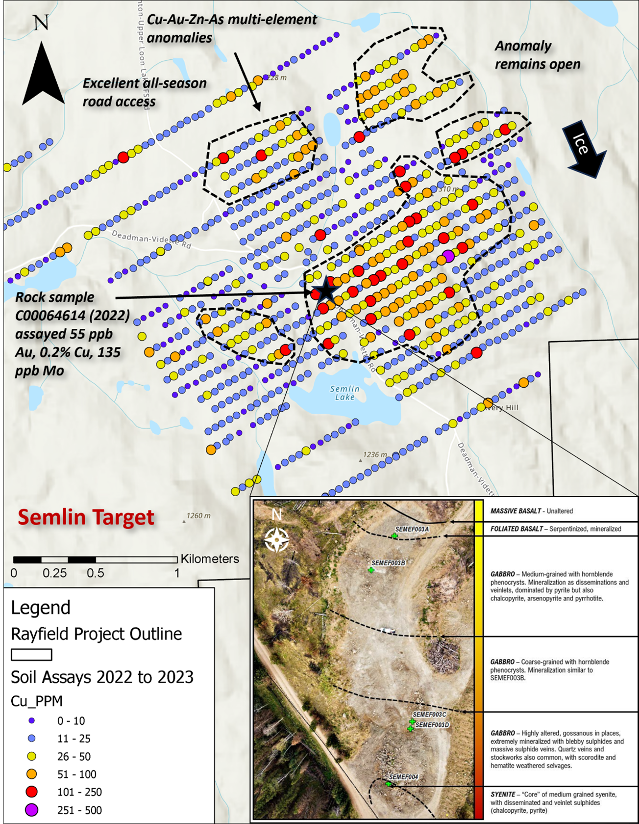 Figure 2: The Semlin target zone is defined by a large 1.7 km x 0.9 km multi-element soil geochemical anomaly which may be outlining a buried porphyry system. The Rayfield target zone is highly prospective, with anomalous copper-in-soil values grading up to ~0.40%, and rock samples grading up to 0.63% Cu and 245 ppb Au. Numerous other target zones also exist across the extensive 35,000-hectare Rayfield Property.
