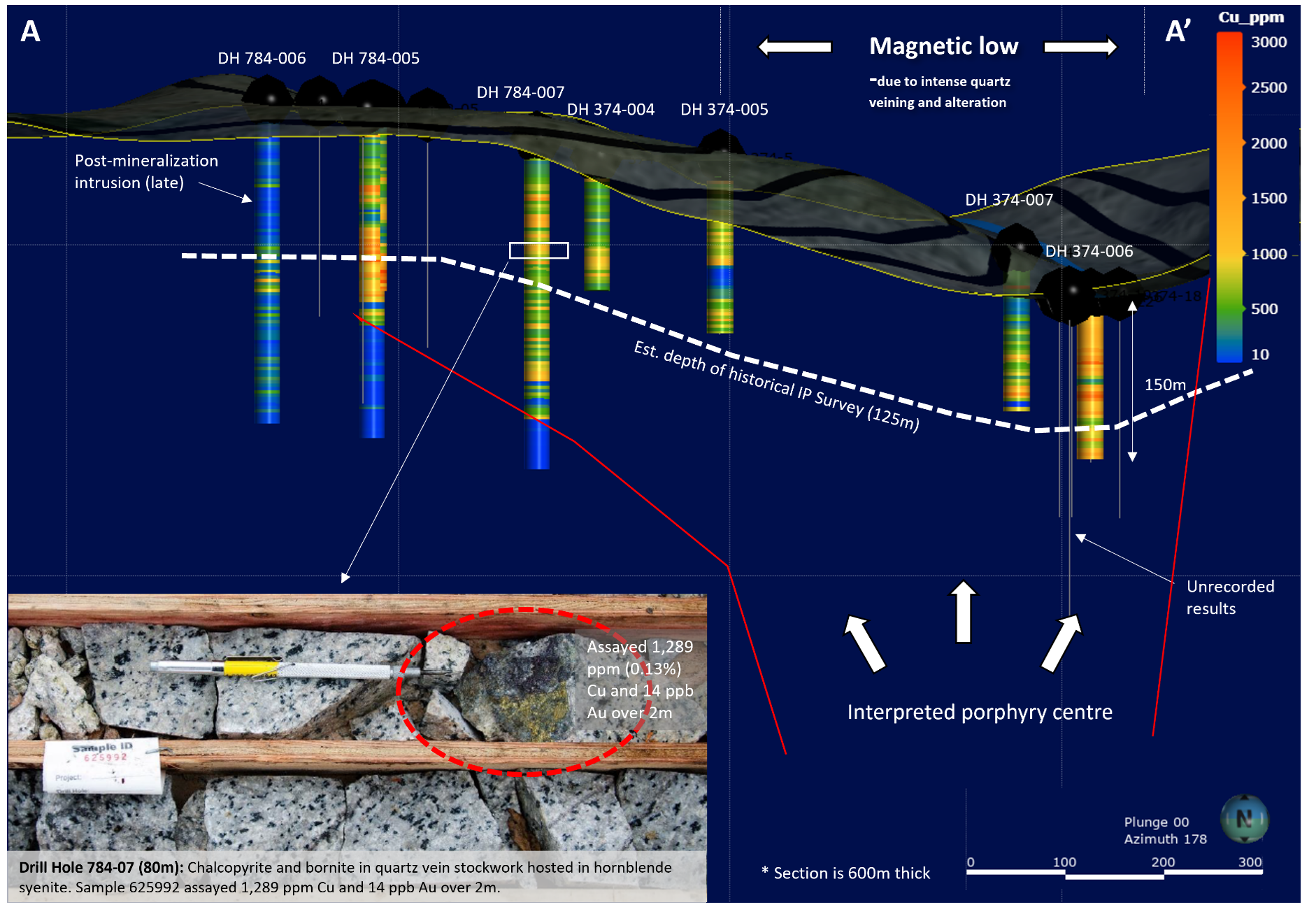 Figure 6: Cross-section A-A’ outlined in Figure 5. Historical drill results with interpreted centre of the porphyry system. Historical induced polarization surveys extend only to ~125m of depth and many of the historical drill holes ended in mineralization. Mineralization is interpreted to remain open along strike and at depth.