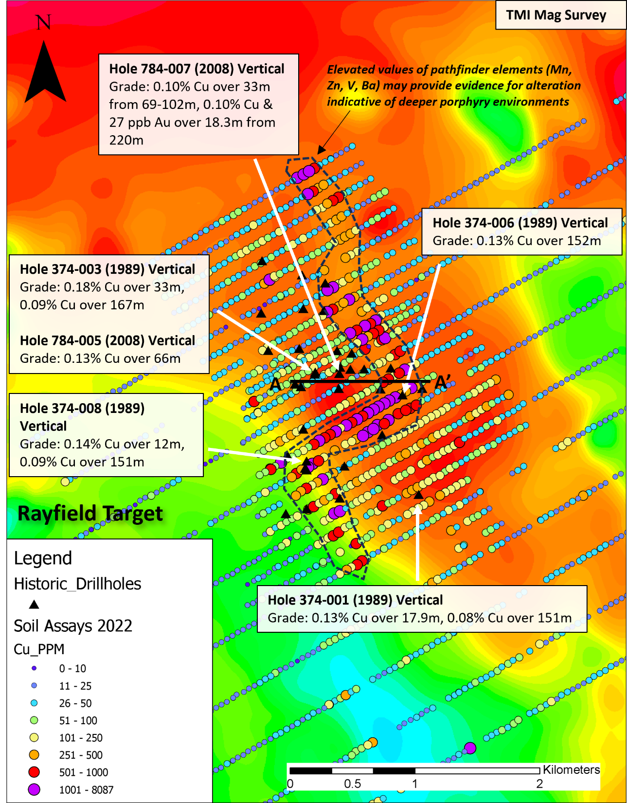 Figure 5: Copper-in-soil assays (2021-2022) overlying TMI Aeromagnetic survey. Elevated values in copper also coincide with pathfinder geochemical elements commonly c associated with deeper sericite and/or propylitic alteration, typically bounding the higher-grade core of porphyry systems. See Figure 6 for cross section A-A’.